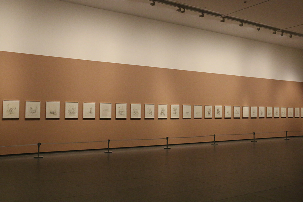 展览按照作品的原顺序展出这套版画,以贾科梅蒂为此所做的配文和七条语录分隔,150幅画延绵整个一号厅和五号厅,墙面刷以波斯菊(cosmos)色以更好的突出纸张。“无尽的巴黎”——这艺术家60年代初生活的影像“自传”,这一场在巴黎如画的旅行,这150幅石版画带领观者从现实进入贾科梅蒂的巴黎,从工作室到咖啡馆,步行或是坐车,在大街小巷,在火车站,在植物园,在费尔南·穆尔乐(Fernand Mourlot)的石版印刷厂,在特里亚德、迪亚哥或是安妮特家里,大约十年的艺术家的日常生活轨迹徐徐展现在我们的眼前。根据特里亚德的回忆,某天走出咖啡馆的时候,贾科梅蒂突然看着眼前的道路惊叹道:“啊巴黎,无尽的巴黎。”于是就这样有了这套作品的名字。Paris sans fin, 逐字翻译就是巴黎没有尽头,有一些版本将它翻译成了永恒的巴黎,并不准确。无尽是永无止尽,是一直动态变化着的,而永恒是恒久不变。“无尽的巴黎”不是生活或是历史场景的碎片,不是相片式的记录,它是肉身在场的绘画世界,是将观者抛入存在的“活过来”的“现场”,穿梭于往昔与现在,不断更新,不断变化着。而作品中大量反复出现的画面(道路、咖啡店接着又是道路),看似相同实则每一次都不同,印证了艺术家“去经验化”的观看方式,更加深了这种永无止尽的感觉。